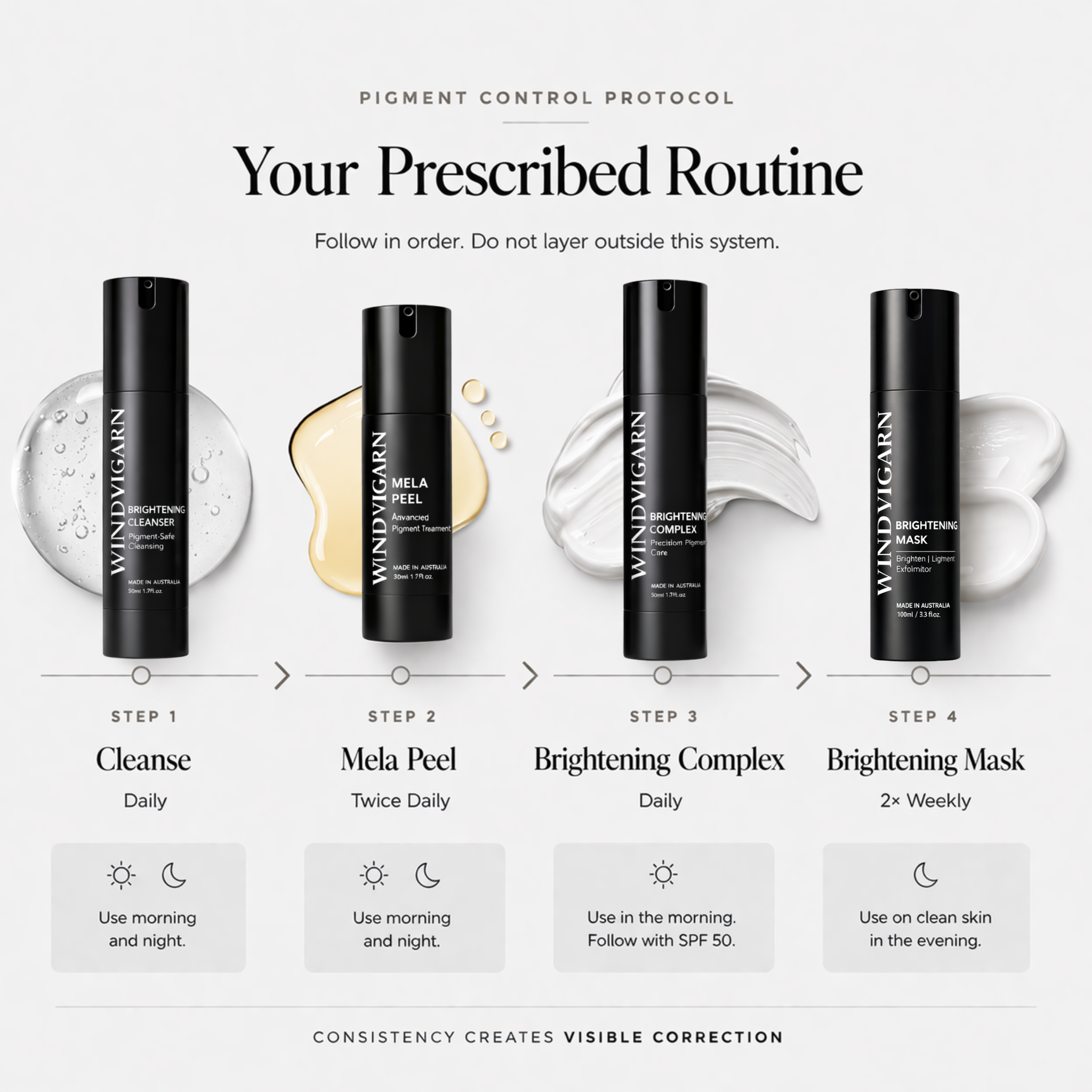 This routine supports skin balance, stability, and early pigment control — without triggering irritation or overcorrection.